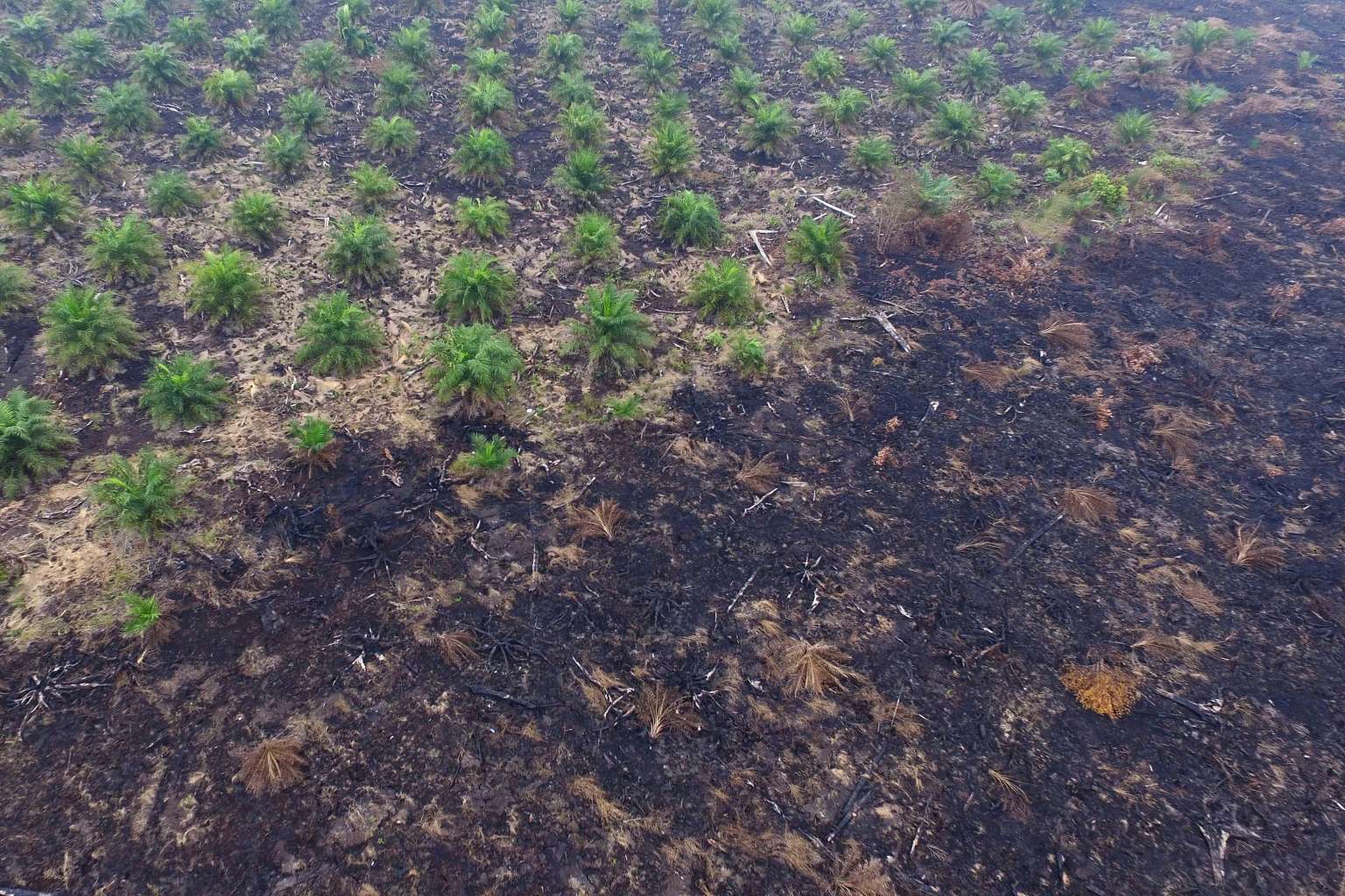 Vegetation grows on a palm oil plantation next to burnt land in Sumatra on Oct 31, 2015.