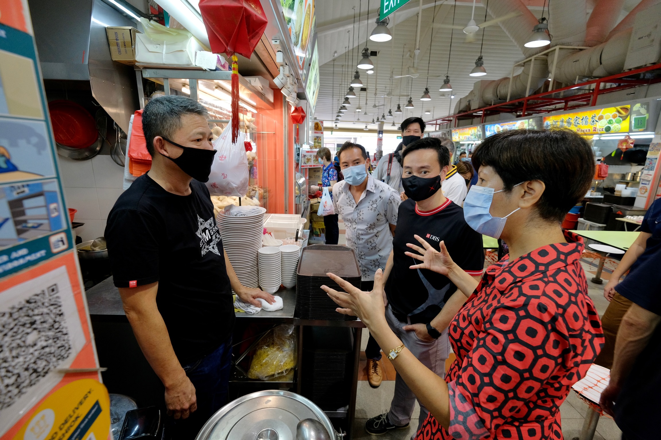 Minister in the Prime Minister's Office Indranee Rajah speaking to a hawker at Tanjong Pagar Plaza Market and Food Centre.