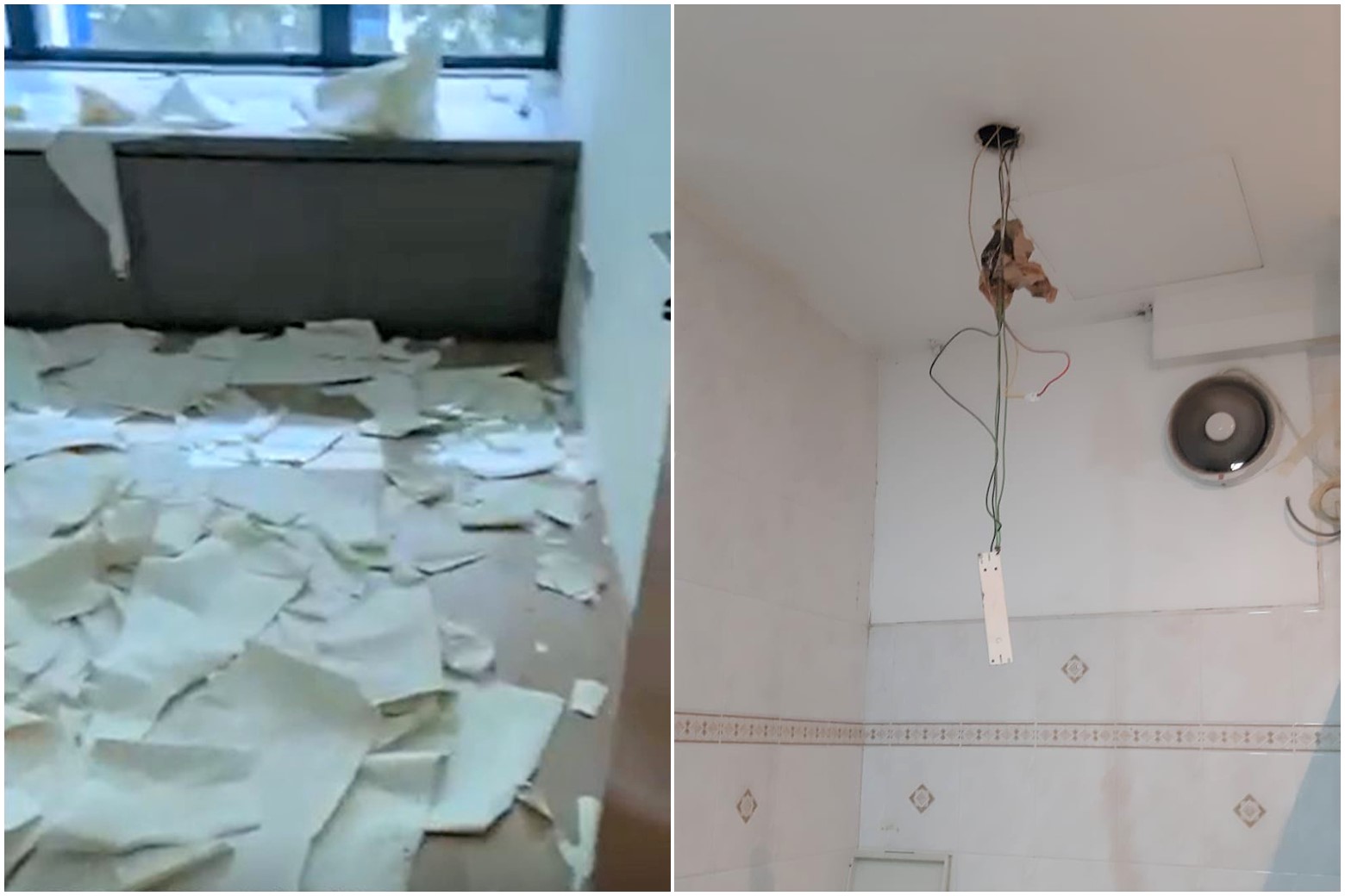 Mr Alex's new home was left in disarray (left) while Ms Lee said wires were left dangling at a tuition centre.