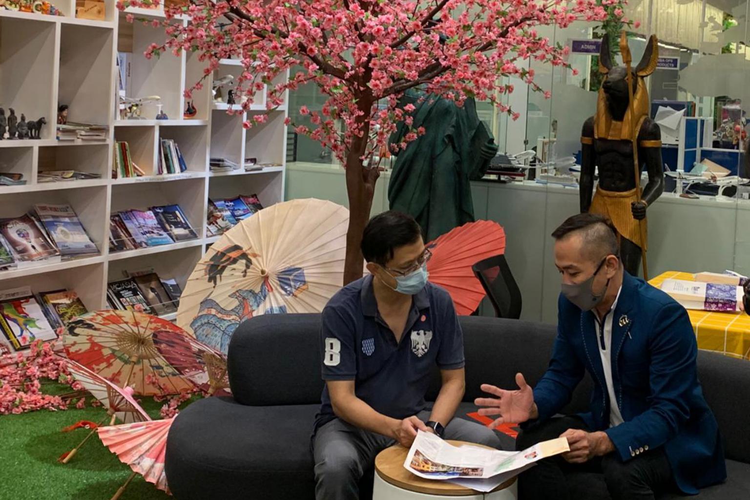 Mr Reuben Lim (left), who will be part of the leisure group tour, speaking with tour manager Gary Teo.