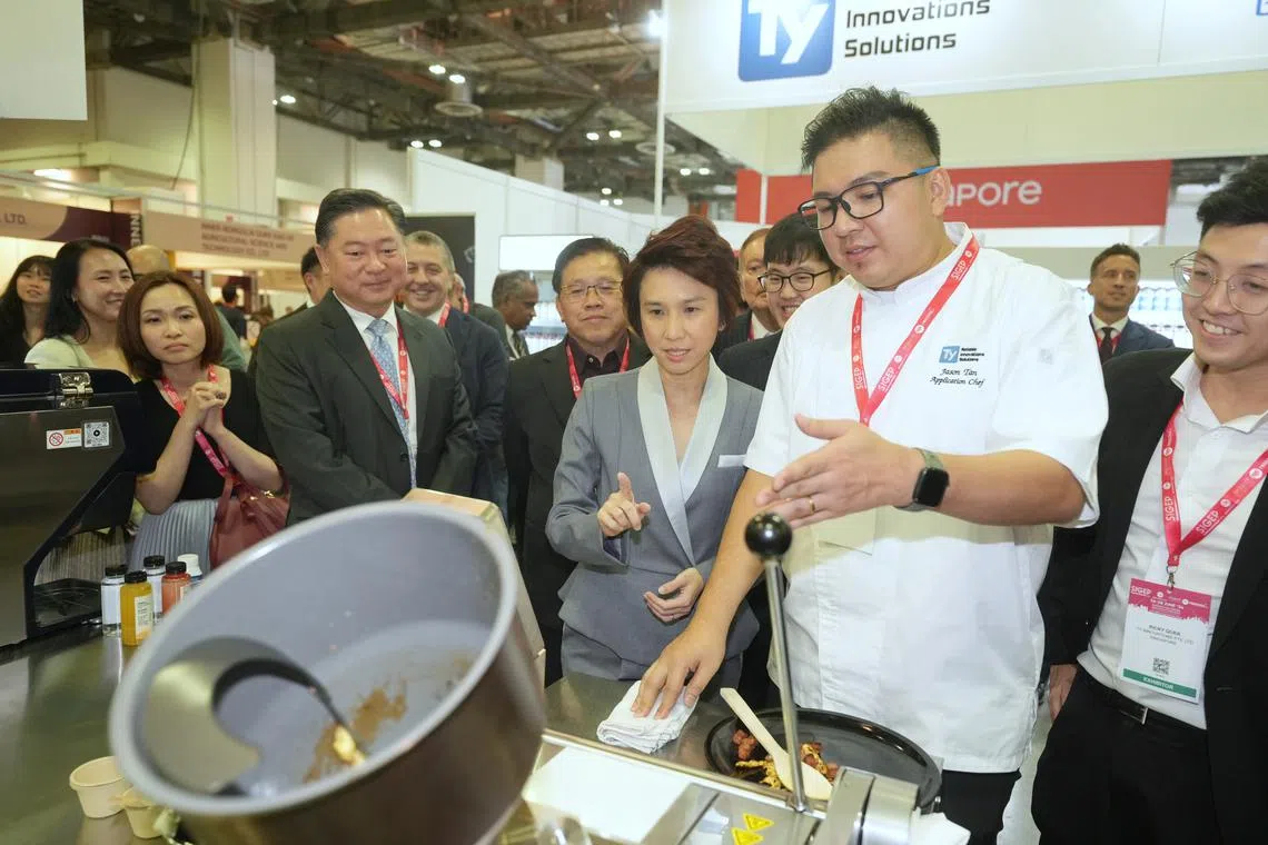 Senior Minister of State for Trade and Industry Low Yen Ling (centre) viewing a demo of a frying robot at the Sands Expo and Convention Centre on June 26.