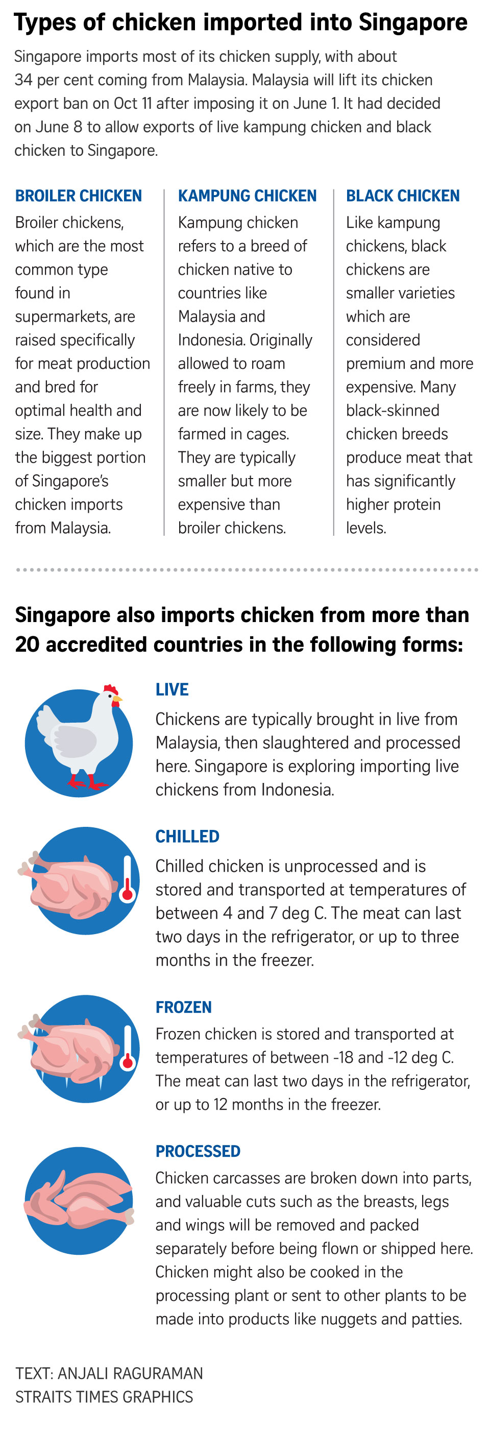 Malaysia imposed the ban on chicken exports on June 1 following a local shortage of supply. At the time, about a third of Singapore's chicken came from Malaysia.