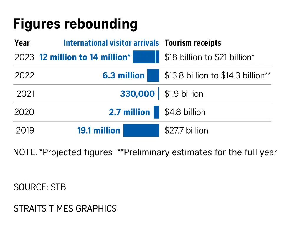 The bullish forecast released on Tuesday by the Singapore Tourism Board (STB) comes on the back of better-than-expected numbers in 2022, which ended with 6.3 million international visitor arrivals and estimated tourism receipts of $14 billion.