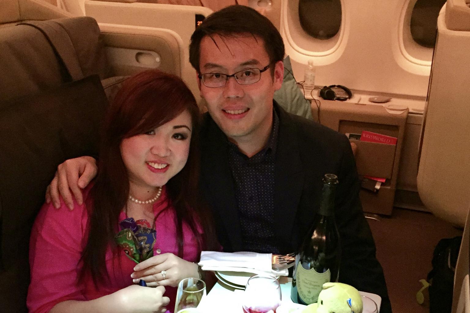 Ms Amy Tay and her husband Tan Si-Rong on an SIA flight to Australia in August 2015, where he proposed to her.