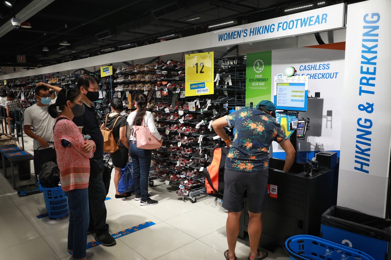 Unlike most retail outlets which have cashiers, Decathlon has switched to cashless, self-checkout kiosks for all its 12 branches.