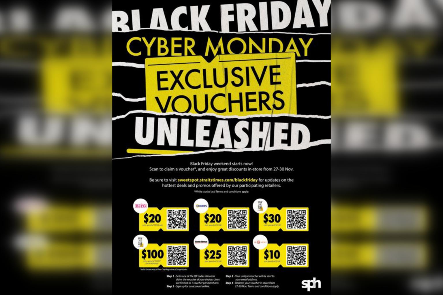 After claiming the vouchers, readers can redeem them at the respective retailers' stores from Friday to Monday (Nov 27 to 30). The vouchers are available in limited quantities and while stocks last.
