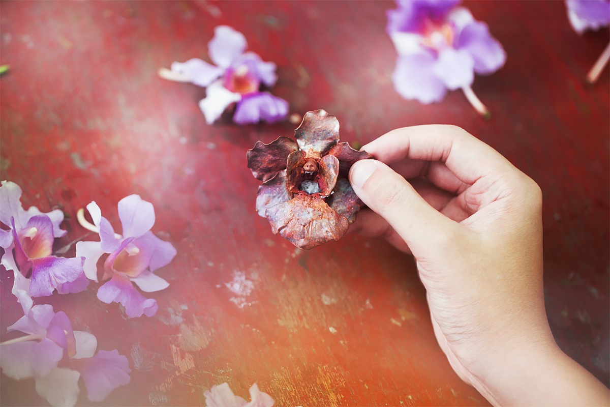 This means picking fresh orchids in a climate-controlled facility, selecting only the fullest orchids with delicate forms, preserving these exquisite flowers in a fine layer of copper, before the piece de resistance: the process of 24K gold plating, which dusts the orchid in a shimmery gold hue. It's a labour-intensive, but critical part of RISIS' brand identity, a special technique that it applies to the preservation of other organic material like roses, ferns, seeds and foliage to create items like brooches, earrings, necklaces and other ornaments.