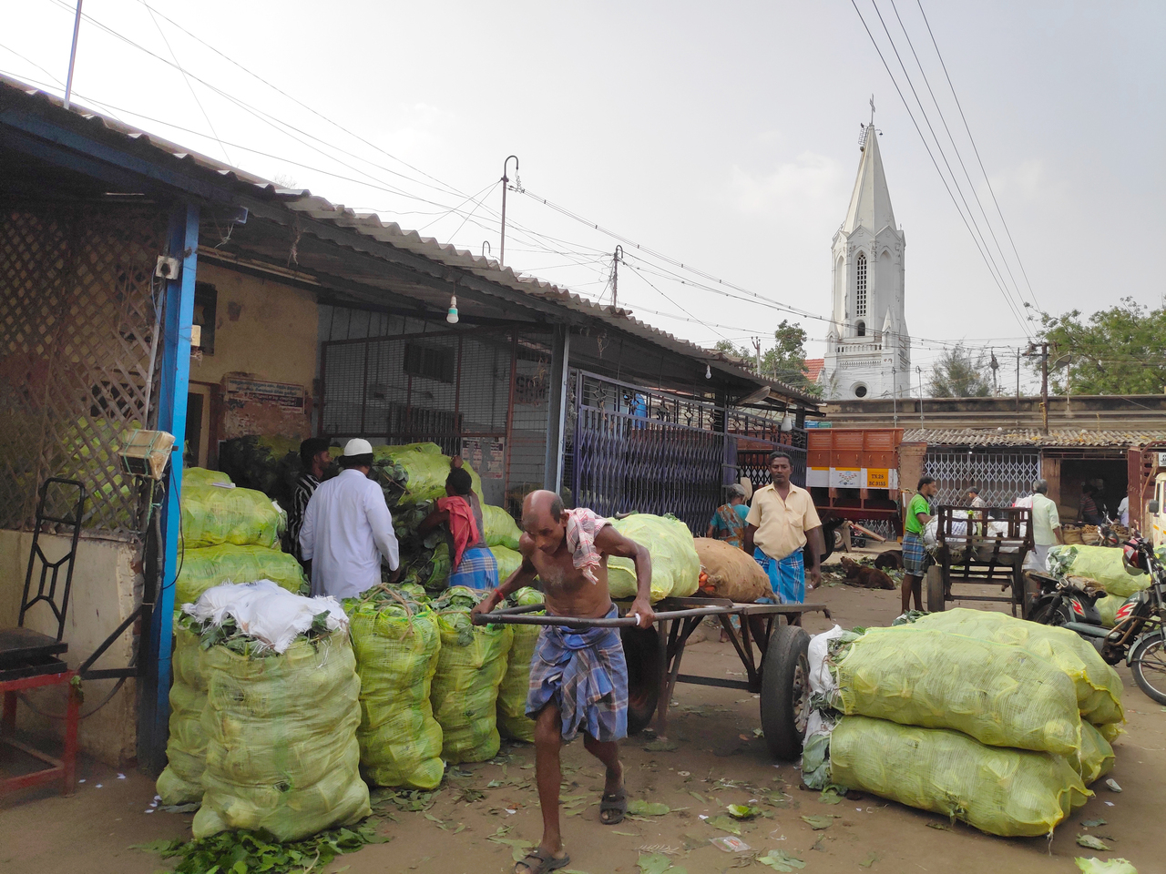 Vegetables getting ready for export in Tiruchirapalli's wholesale vegetable market.