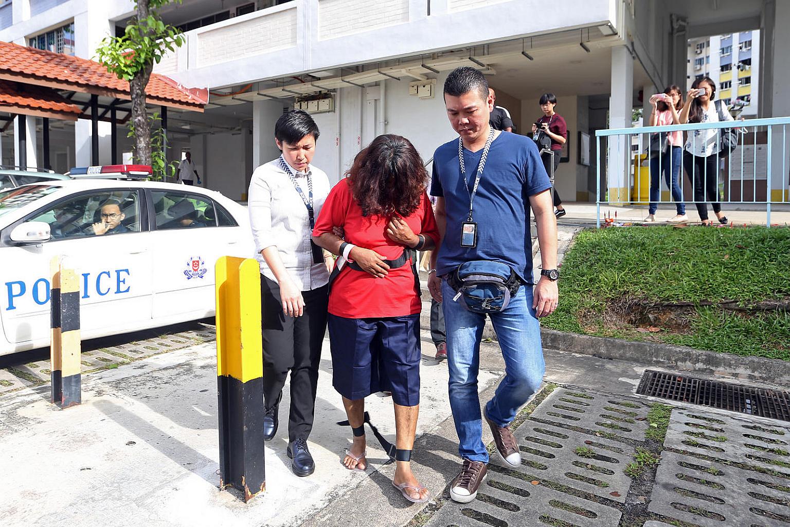 Prema Naraynasamy, 58, being brought back to the crime scene by police for investigations on Aug 3, 2016.