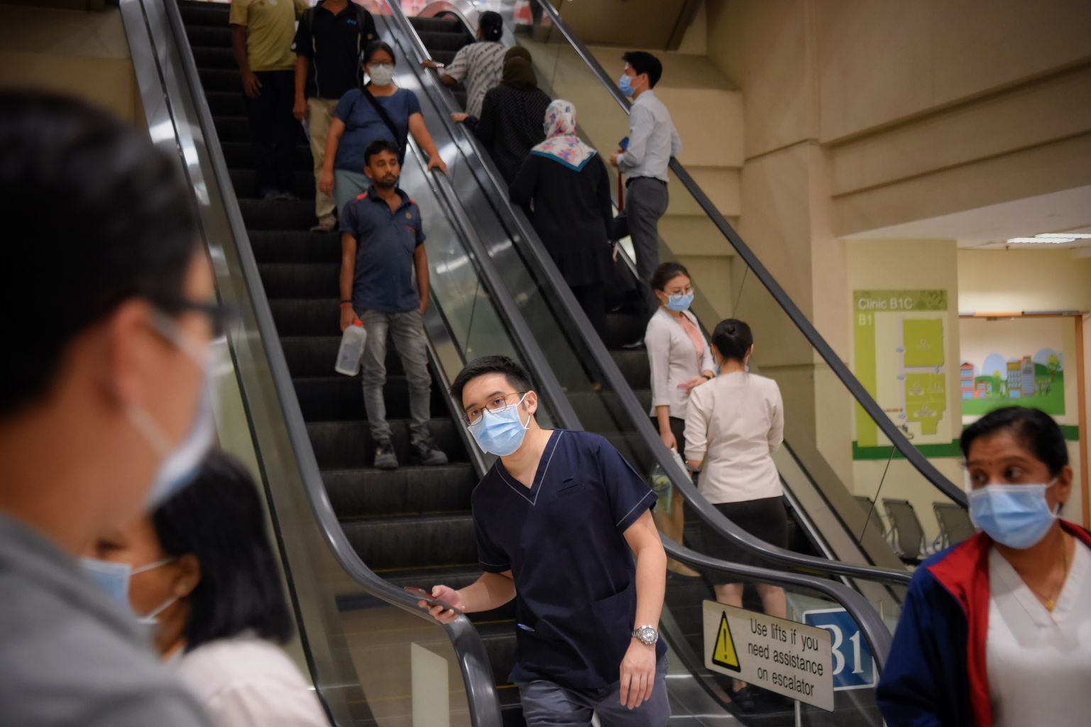 Staff and visitors pictured at Tan Tock Seng Hospital on 3 April, 2020.