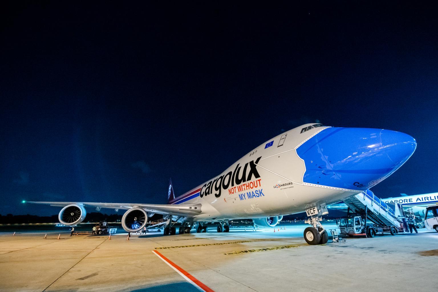 SINGAPORE - The blue mask is a common sight these days but on Thursday (Aug 27) morning, it was spotted on a Cargolux Airlines Boeing 747-8 at Changi Airport.