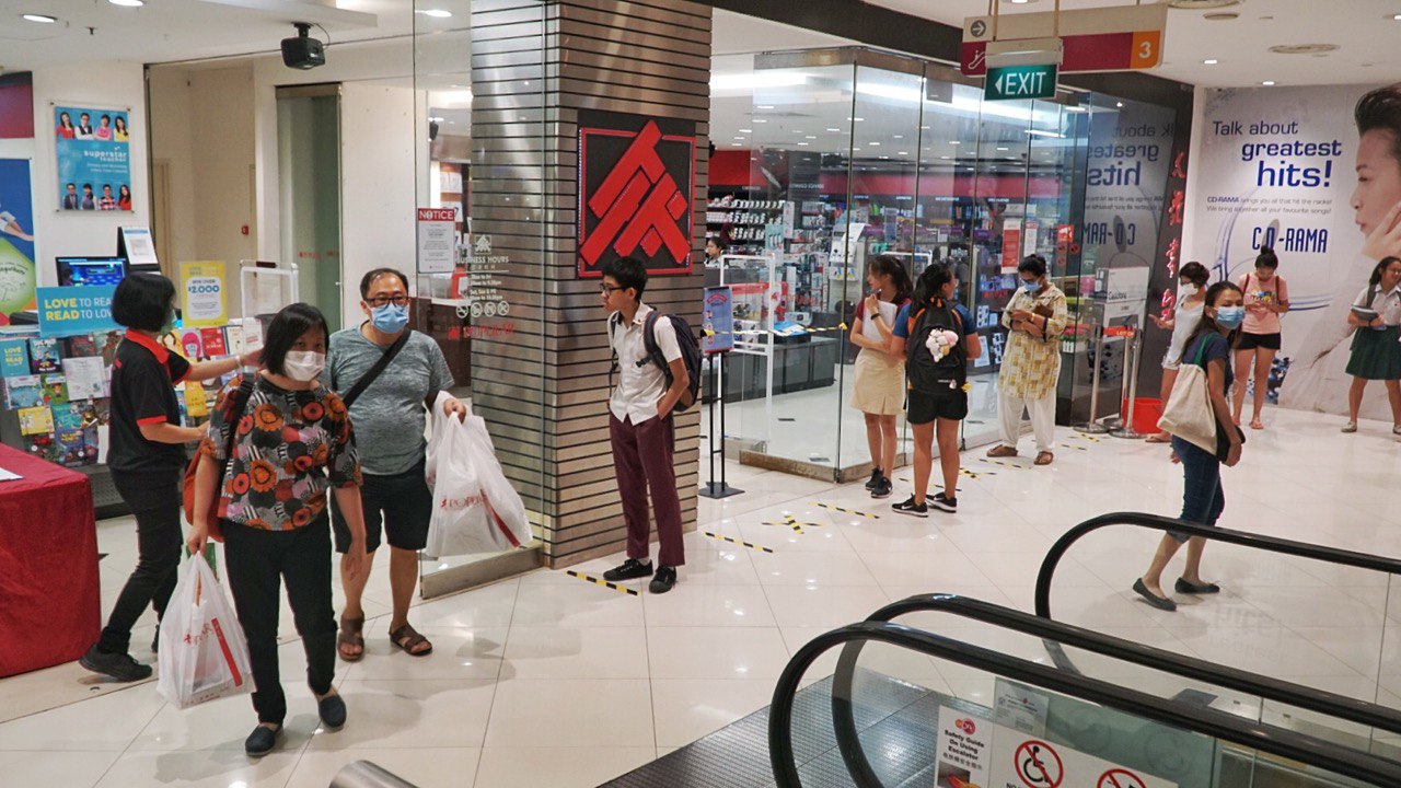 One parent, who wanted to be known only as Mrs Teo, waited in line at the Popular branch in Lot One shopping mall in Choa Chu Kang to buy stationary and assessment books for her 11-year-old daughter in preparation for home-based learning.