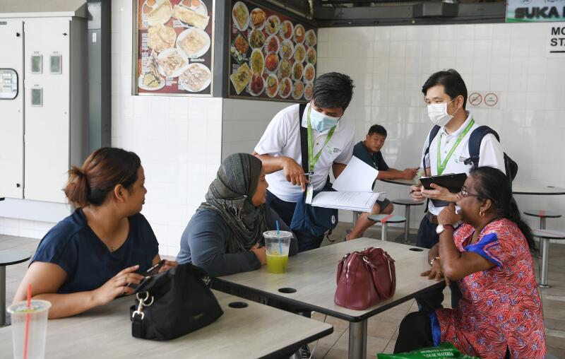 Footfall was brisk at Marsiling Mall Hawker Centre during lunch hour as NEA officers made their rounds, with most customers adhering to the safe distancing regulations, while hawkers rehearsed for the new normal of more takeaways and no dine-ins that will kick in on Tuesday.