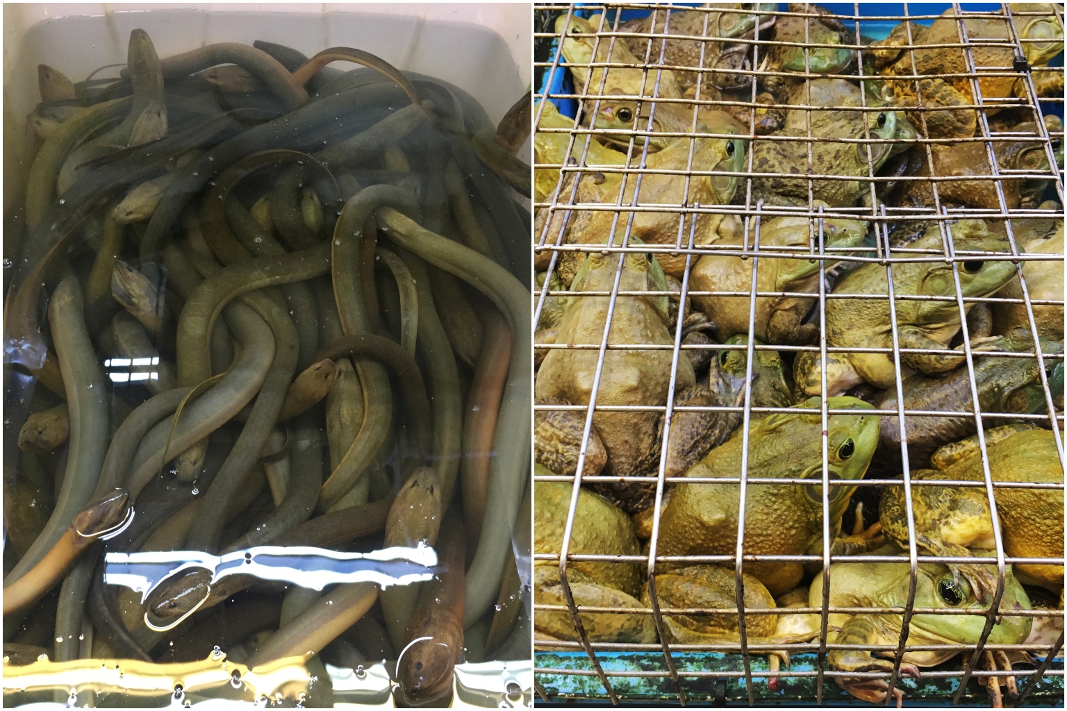 At least 20 freshwater eels were held inside a plastic box filled with water at the same stall, with barely any space for the creatures to move.