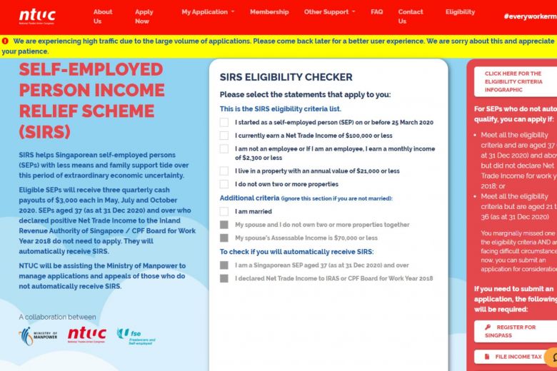 SINGAPORE - Online applications for the Self-Employed Person Income Relief Scheme (Sirs), which are made through the National Trades Union Congress (NTUC) website, reopened at around 7.30pm on Tuesday (April 28) after the page was taken offline for most of the day to upgrade its system.
