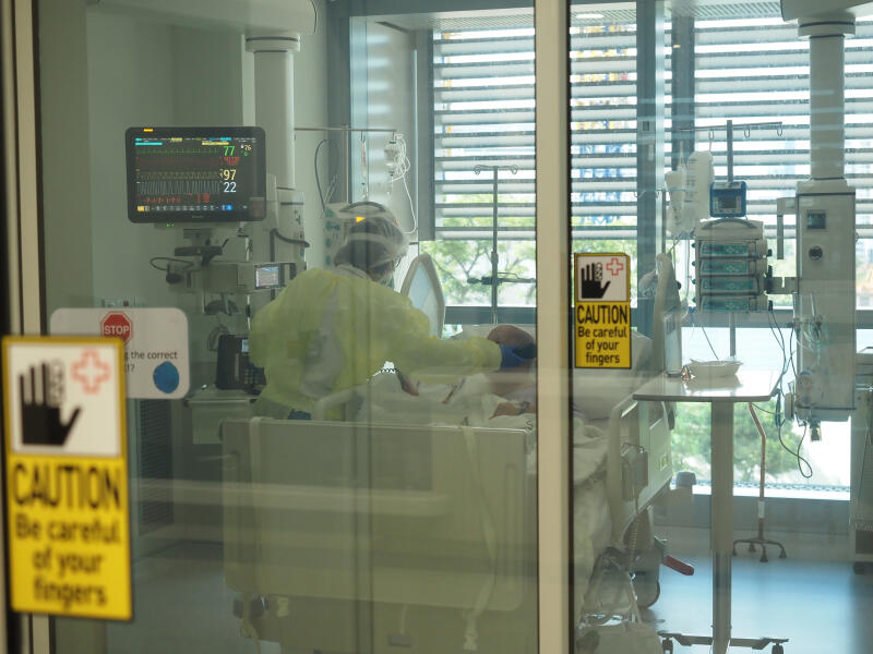 A photo taken on July 21, 2020, showing a medical worker tending to a patient inside an ICU at the National Centre for Infectious Diseases.