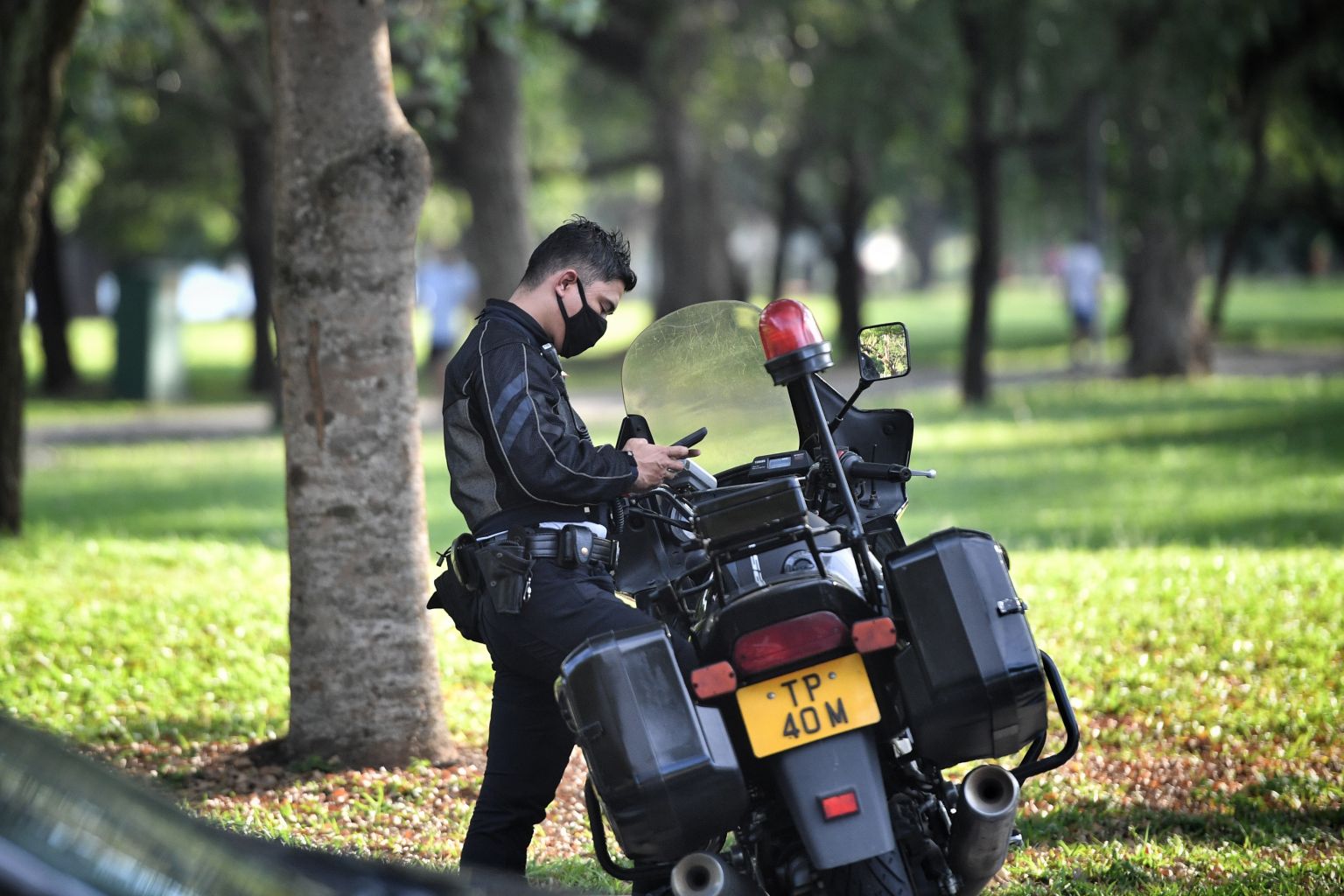 A traffic police officer wearing a face mask is seen at Bedok Reservoir Park carpark.