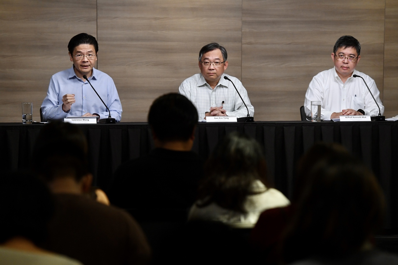 (From left) National Development Minister Lawrence Wong, Health Minister Gan Kim Yong and Director of Medical Services at the Ministry of Health Kenneth Mak during a press conference on Feb 14, 2020.