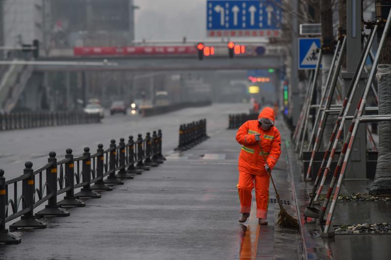 A worker wearing a protective face mask sweeps a street in Wuhan on Jan 25, 2020. The Singapore Red Cross is making a public appeal for funds to aid the communities in China affected by the coronavirus outbreak that originated in Wuhan.