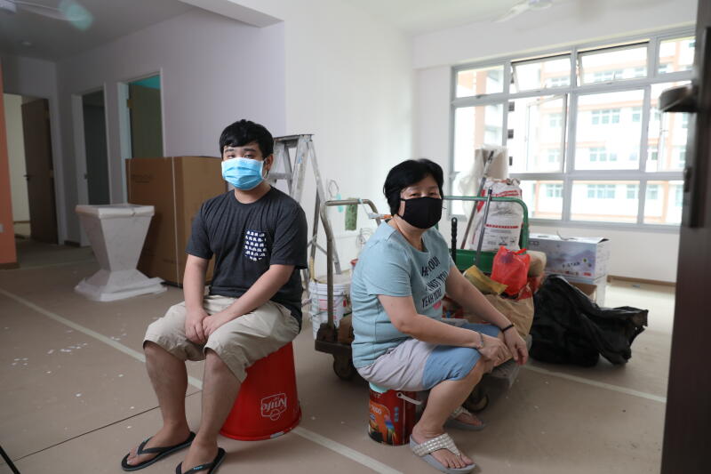 Madam Susie Koh (right) and her son, Mr Joshua Tan, in their half-renovated flat in Sengkang.