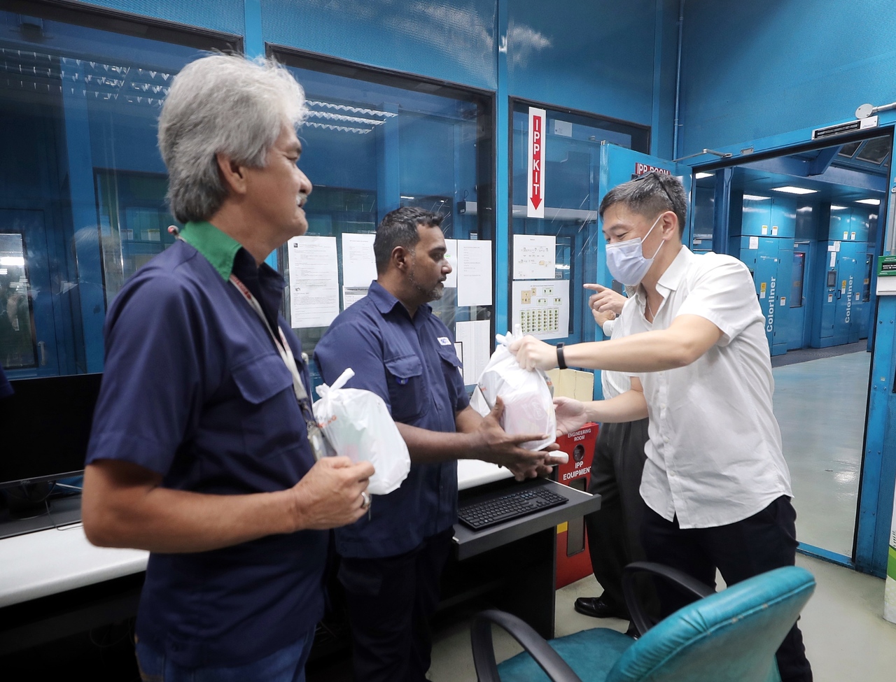 On Saturday, Mr Tan visited SPH's print centre at Jurong Port Road, where he handed out care packages containing items such as vouchers for daily necessities, hand sanitiser, biscuits and Milo packets to the staff.