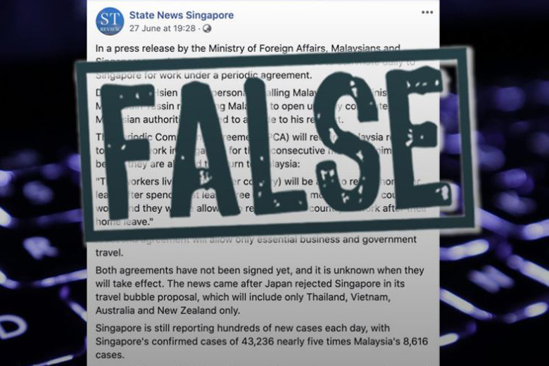 According to the Pofma Office, the State News Singapore Facebook page made false statements of fact about cross-border travel arrangements between Singapore and Malaysia in a post published on June 27. The post was shared on Mr Alex Tan's Facebook page.