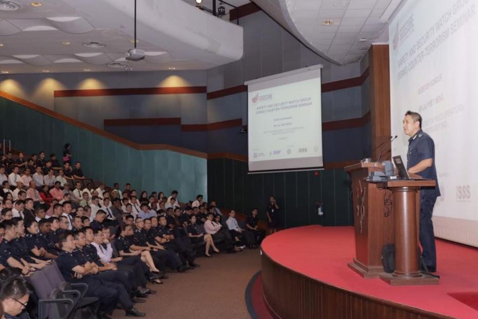 Deputy Commissioner of Police (Operations), Mr Lau Peet Meng, addressing the participants of the Safety & Security Watch Group counter-terrorism seminar at Hwa Chong Institution on June 8, 2017.