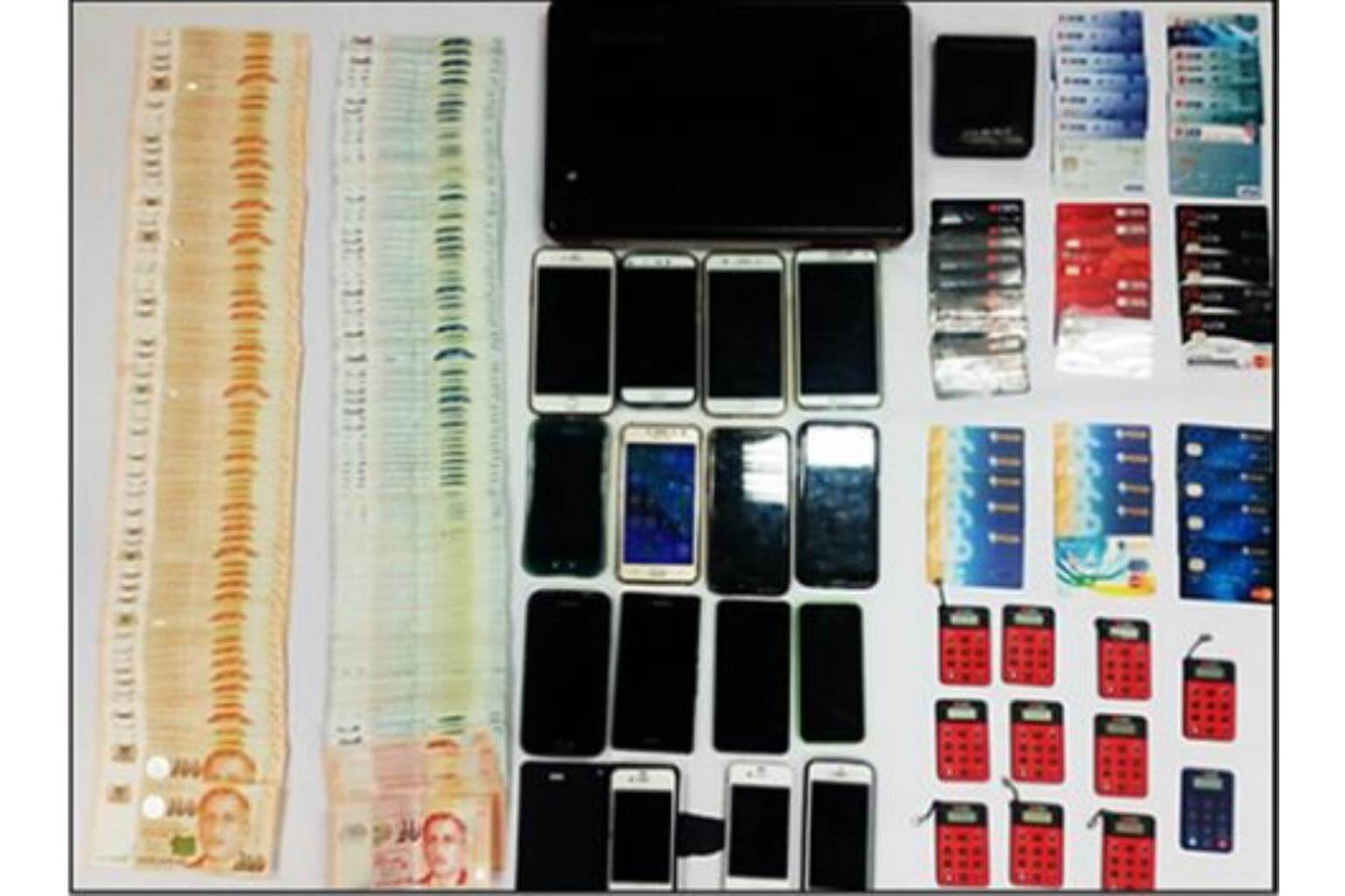 The police seized various items as case exhibits in this operation, including $24,768 in cash, mobile phones, ATM cards, Internet banking dongles and a laptop.