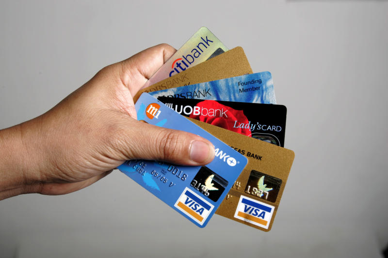 Posed photo of a person holding 6 credit cards. Yang Jiafeng bought from Mr Tree multiple credit card details belonging to others.