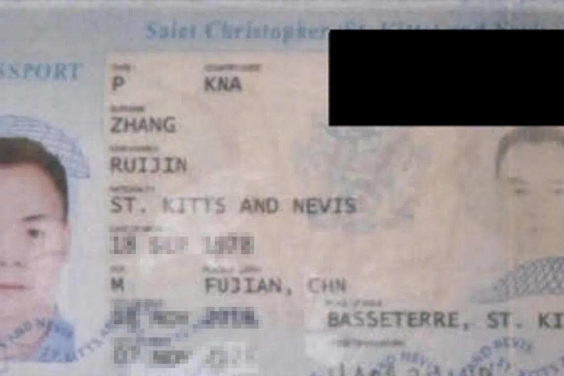 A passport in the name of Zhang Ruijin, issued by Saint Kitts and Nevis.