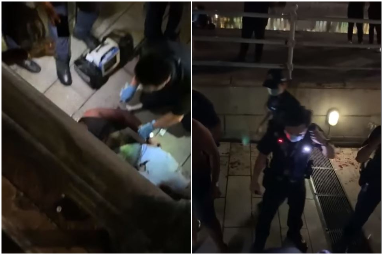 Near the end of the three-minute video, blood can be seen splattered on the wall and floor of the walkway leading to an underpass outside The Central as paramedics tend to a man lying down.