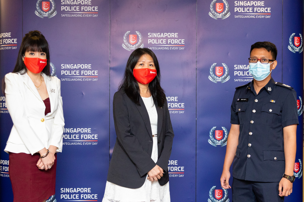 (From left) OCBC branch manager Winnie Chng, OCBC customer service manager Goh Swee Lee and Senior Staff Sergeant Muhammad Hasif.