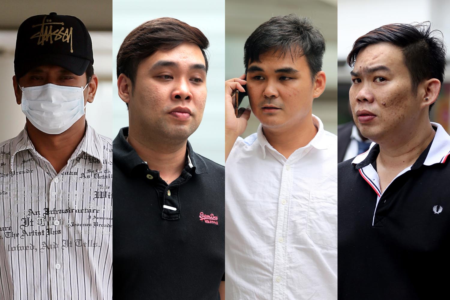 (From left) Koh Guan Seng, Kam Kok Keong, Lim Hong Ching and Kelvin Lim Zhi Wei admitted to conspiring to cheat customers. Their alleged accomplice, Jover Chew Chiew Loon, owner of the now-defunct shop, will have his case mentioned on Oct 28.
