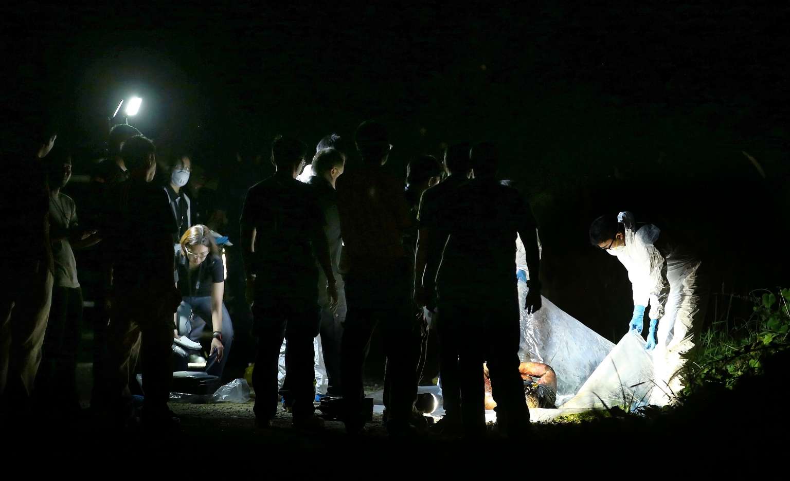Police investigators with the body of Mr Dexmon Chua in a military training area near Sungei Gudong camp.