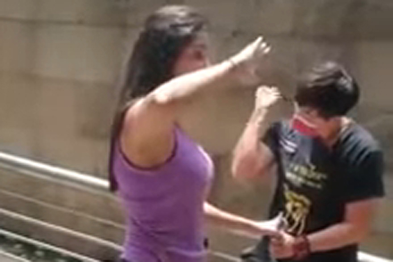 In another clip, at a different location, she can be seen covering her face with her arm and holding on to a phone together with a 47-year-old woman, whom she allegedly assaulted, while arguing with another group of people.