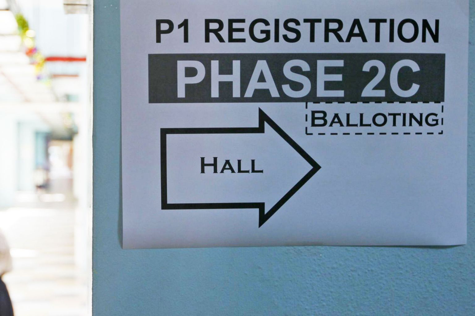 A sign directing parents to the primary one registration phase 2C at a school on Aug 6, 2013.