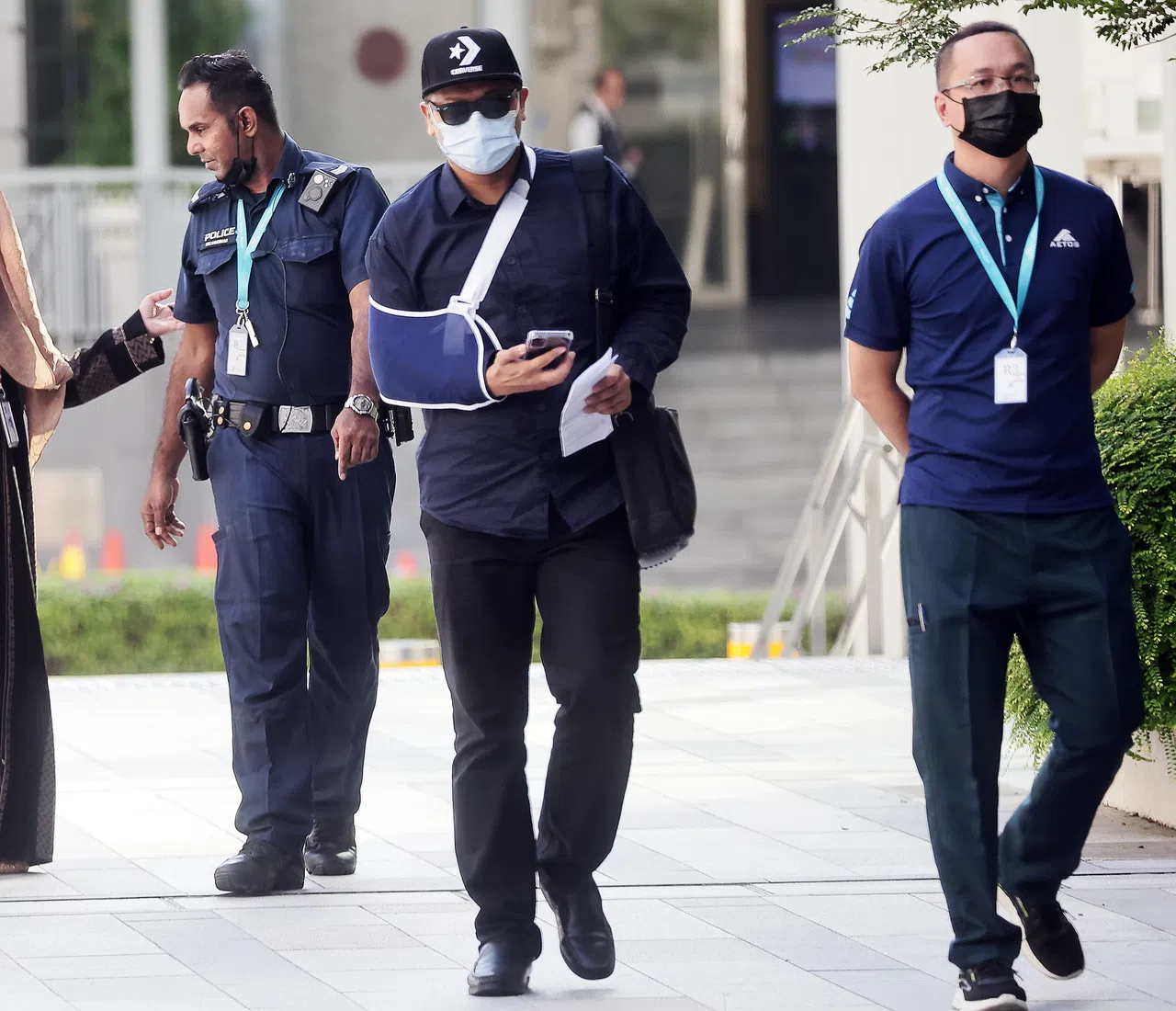 Syafie arrived at the State Courts at around 8.30am with his arm in a sling. He was escorted by the police and Aetos officers.