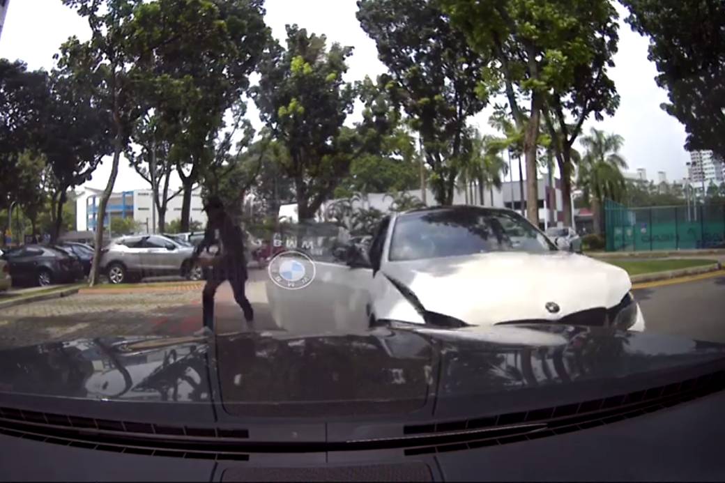 A screengrab of a dashcam video showing the driver of a BMW coupe abandoning his BMW at a carpark.