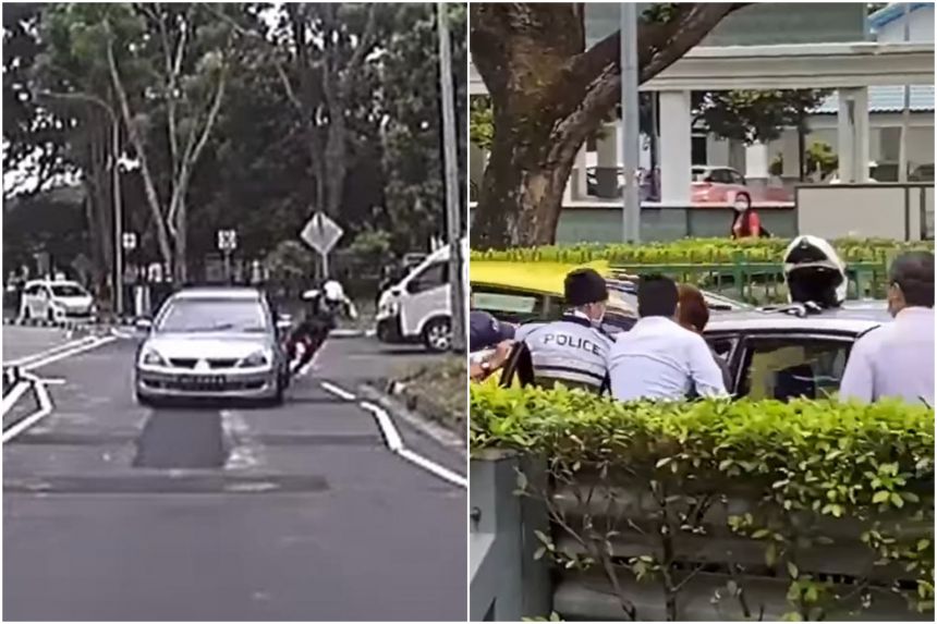 The car stopped briefly at Geylang East Avenue 1, but suddenly reversed against the flow of traffic and into the officer on his motorcycle, before speeding off.