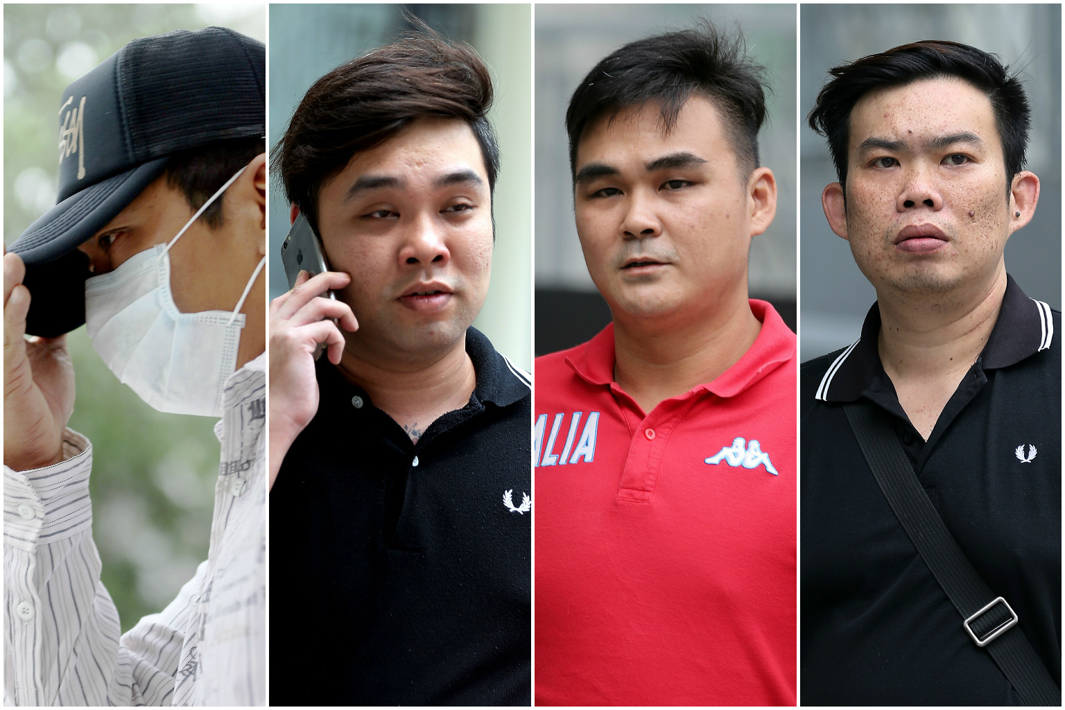 Mobile Air salesmen (from left) Koh Guan Seng, Kam Kok Keong, Lim Hong Ching, and Kelvin Lim Zhi Wei were each jailed between four and 14 months for engaging in conspiracy to cheat walk-in customers, on Wednesday, Oct 14, 2015.