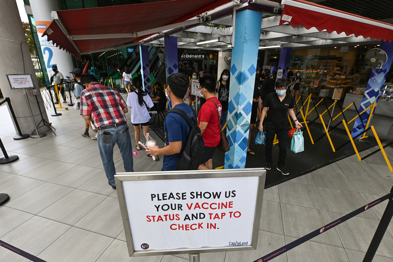 People showing their vaccine status before entering Tampines Mall on Feb 25, 2022.