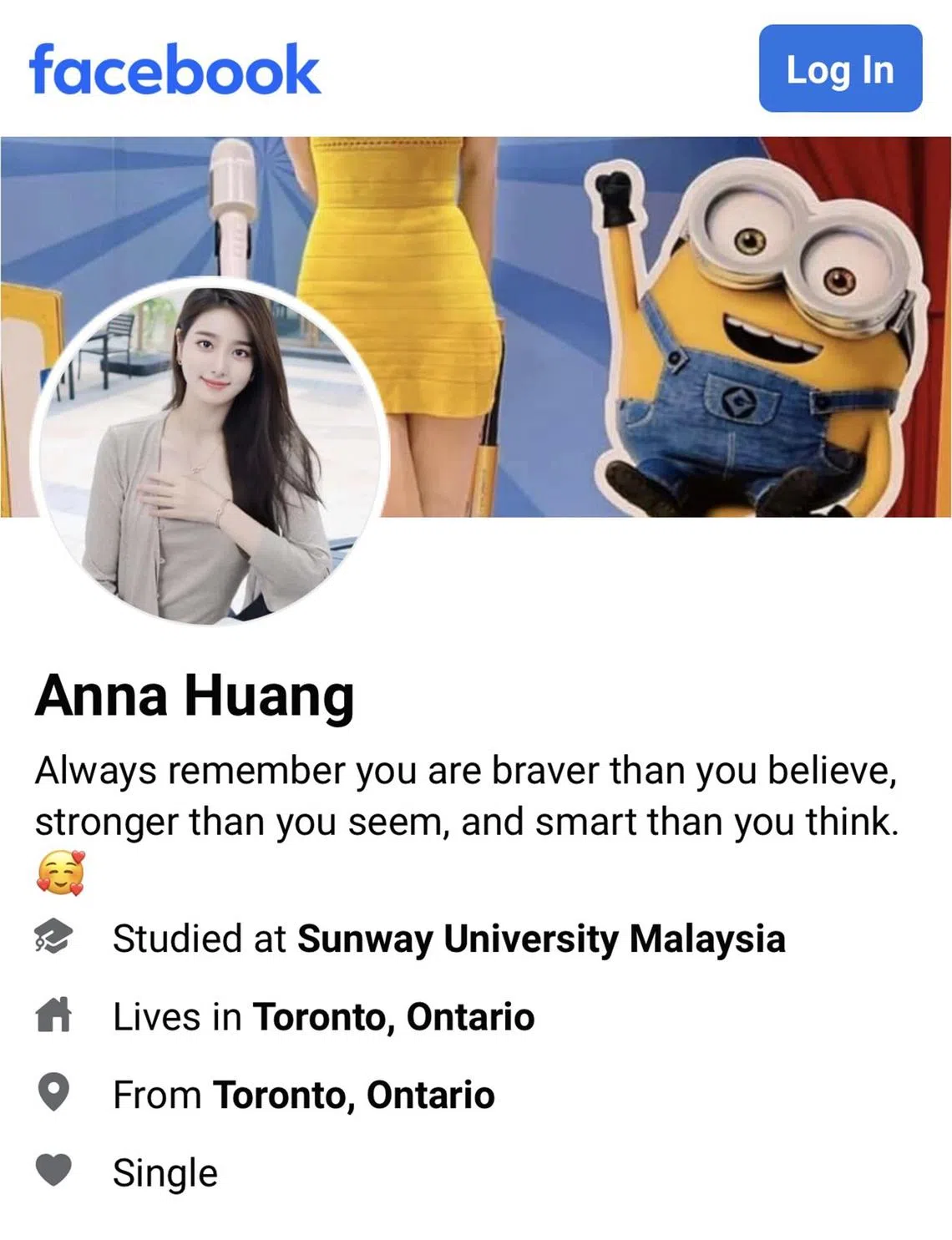 One of the fake Facebook profiles Mr Salam created was a half-Asian, half-Western woman named “Anna Huang”. He used this profile to build a relationship with victims before conning them.