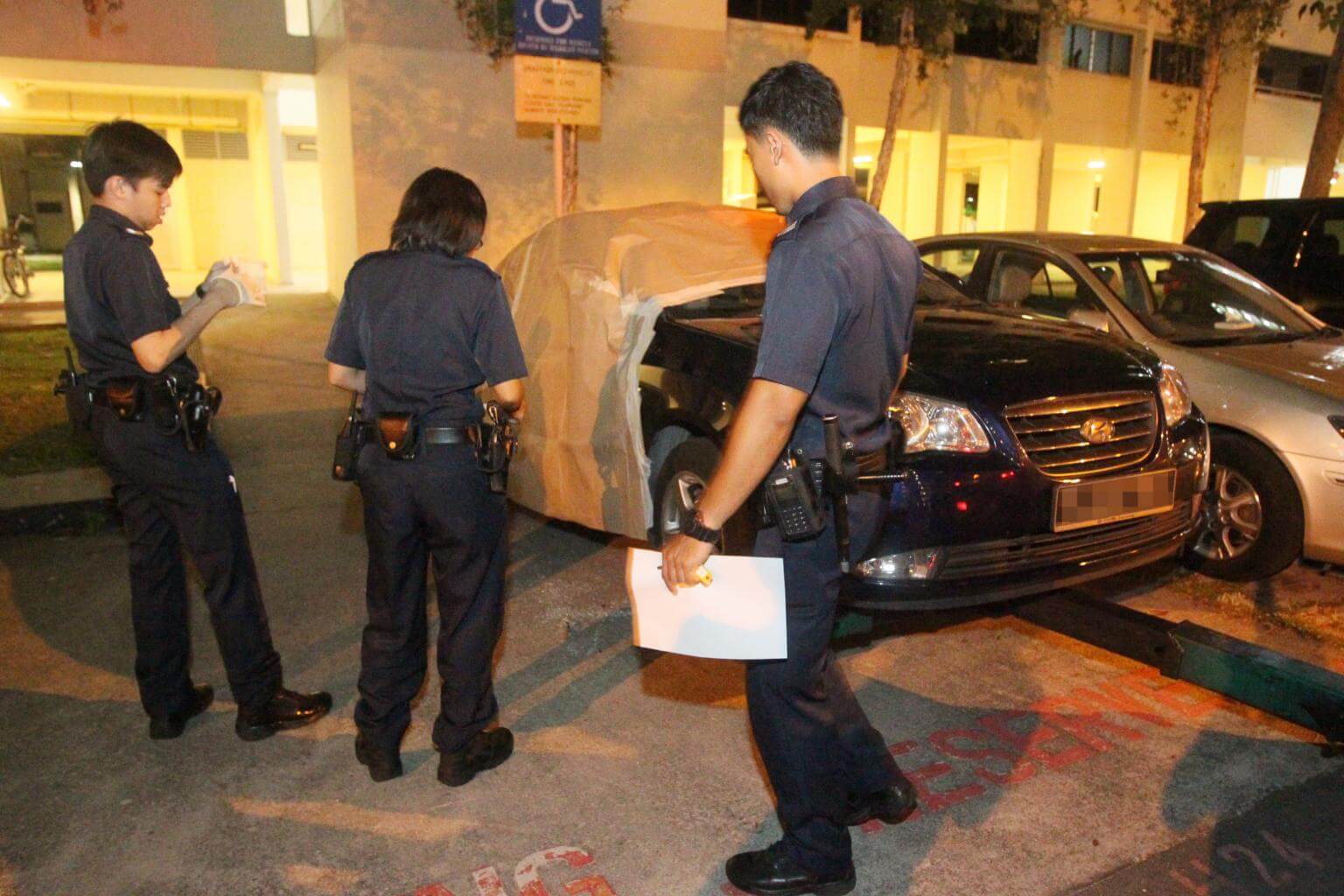 Police officers at the crime scene where money- changing business manager Ali Yousof Saiboo was robbed of more than $600,000 in cash at the carpark at Block 110 Aljunied Crescent on Nov 5, 2014.