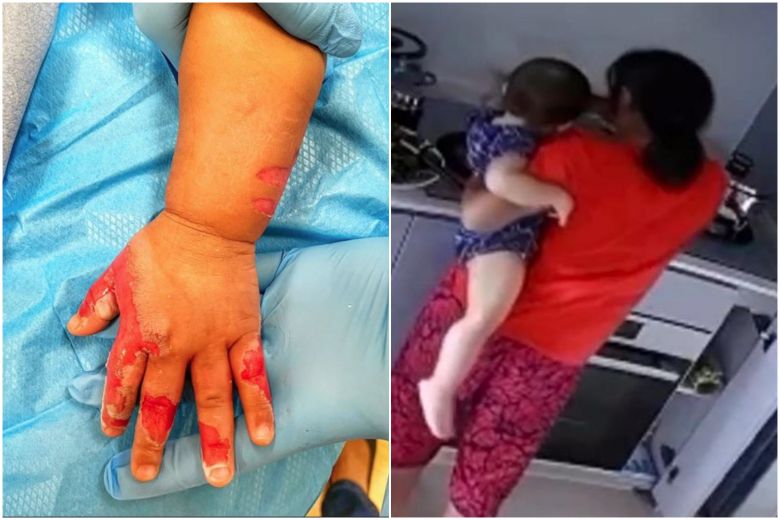 Deputy Public Prosecutor Jane Lim said: "While the accused was carrying the victim, she felt agitated and moved the victim's left hand towards the pot containing hot water, which was on a stove that was turned on, causing the victim's left hand to come into contact with the pot and hot water two to three times, with the knowledge that she was likely to cause hurt to the victim."
