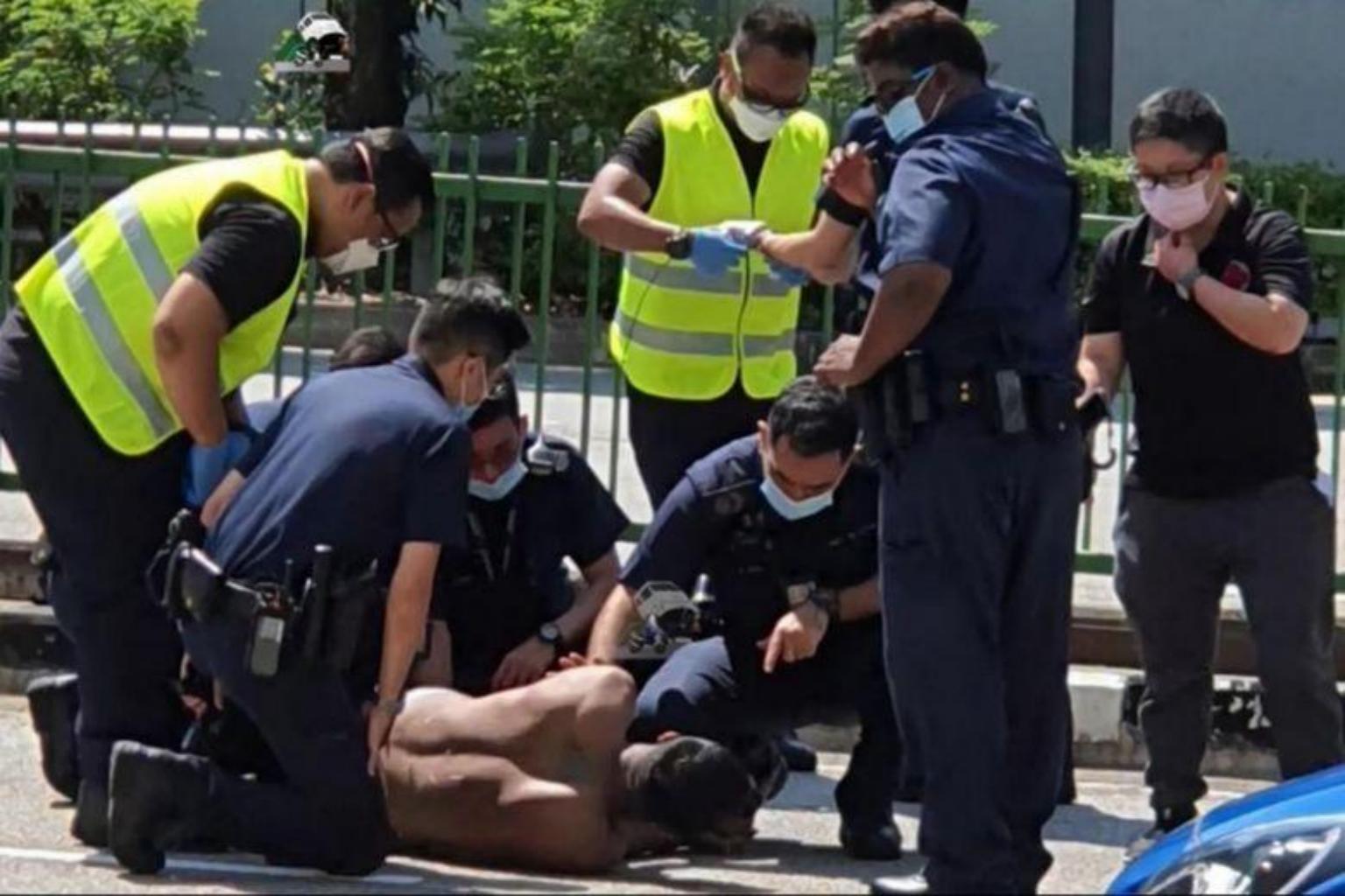 SINGAPORE - A man who continued walking on a busy road attacked police officers who tried to arrest him when he ignored their orders to move to safety.