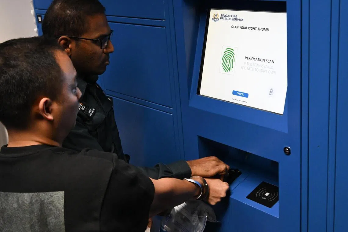 A simulation of an inmate scanning his fingerprint to seal his belongings in a locker at the State Courts as part of the inmate admission process.