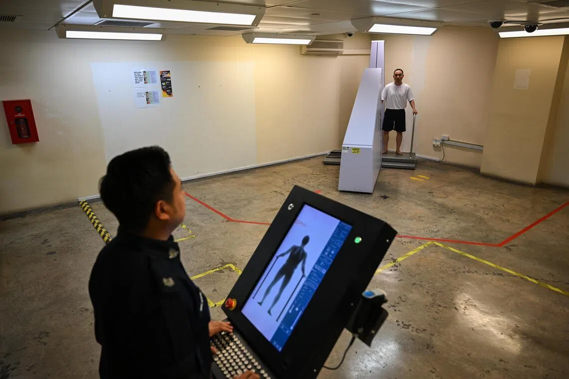 Once inmates arrive at CPC, they are screened by a sniffer dog for contraband. They will be given a thorough body search by prison officers and put through a body scan machine.