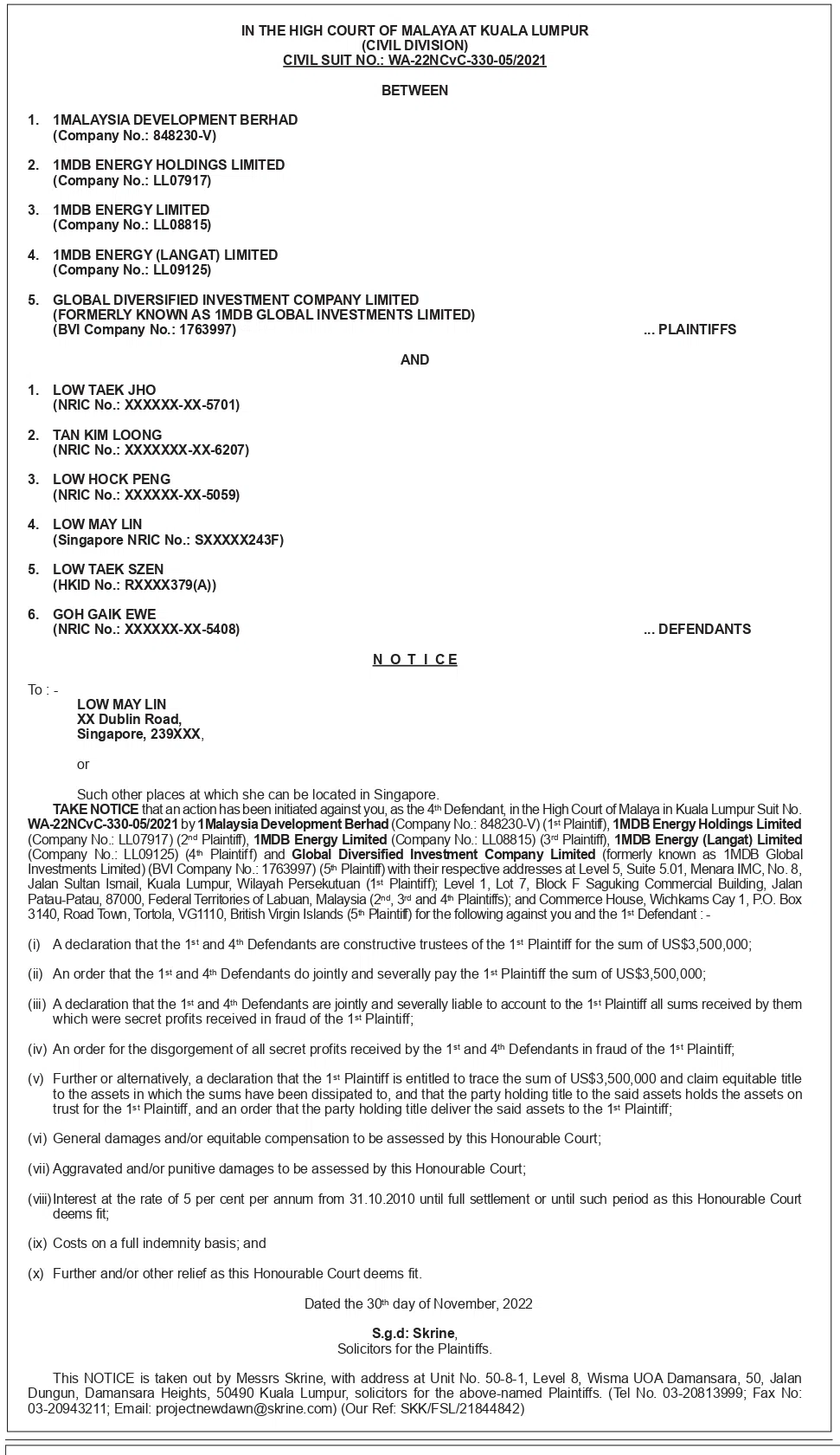 SINGAPORE – A writ of summons has been served against Ms Low May Lin, the sister of Malaysian fugitive Jho Low, who is linked to the theft of US$4.5 billion (S$6.15 billion) from 1Malaysia Development Berhad (1MDB),