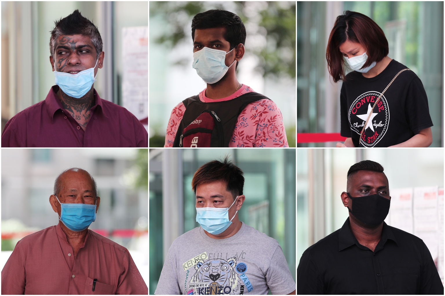 (Clockwise from top left) Vijayan Pillay Sandarasegaran, Arvinish N. Ramakrishnan, Cheng Fengzhao, Kumaran Roy Rajendran, Wong Teck Chye and Tan Han Yong were charged in court on May 15, 2020.