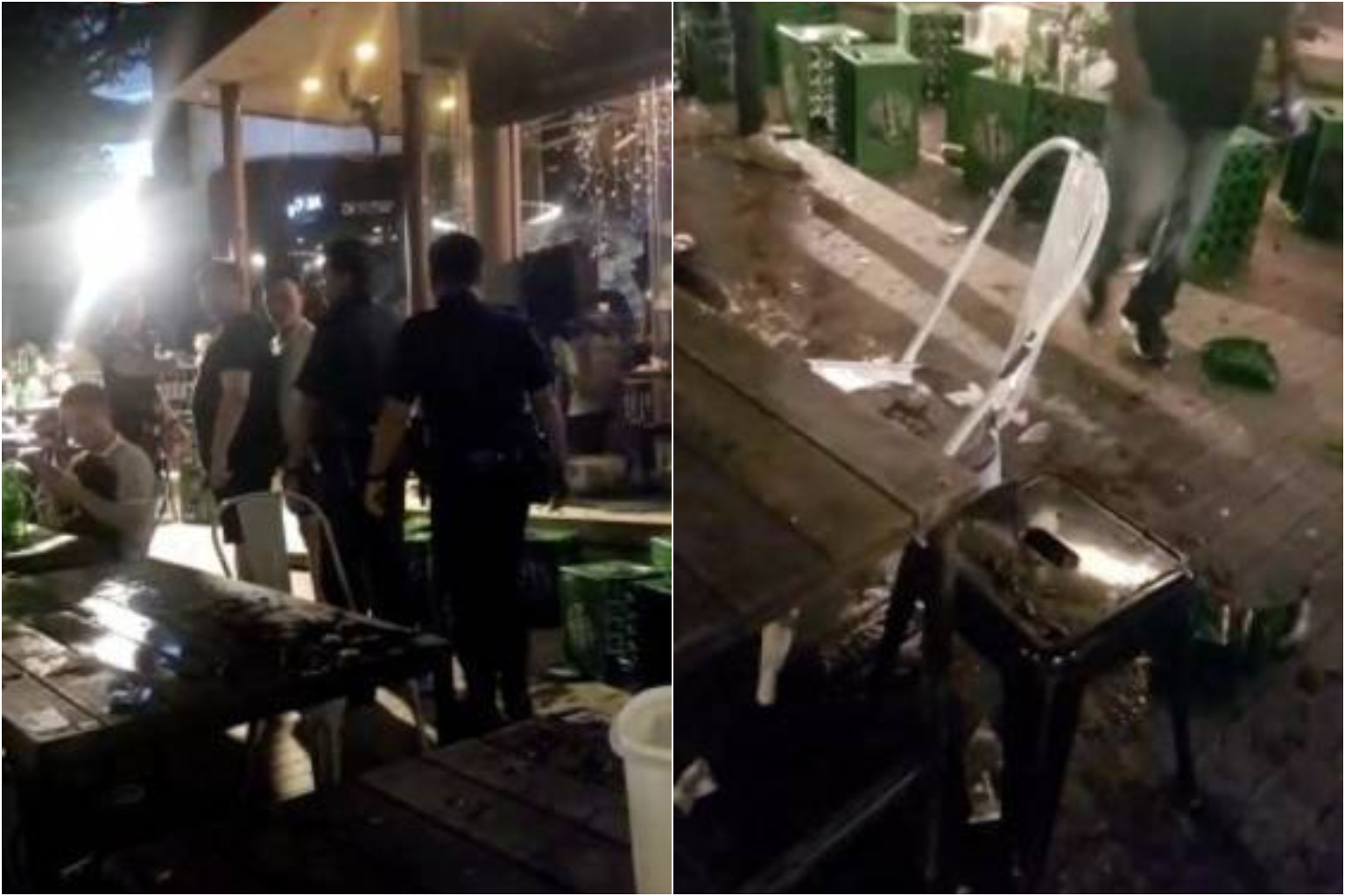 Screenshots from a video sent to citizen journalism website Stomp show beer crates toppled on the ground and at least two police officers escorting two men away.